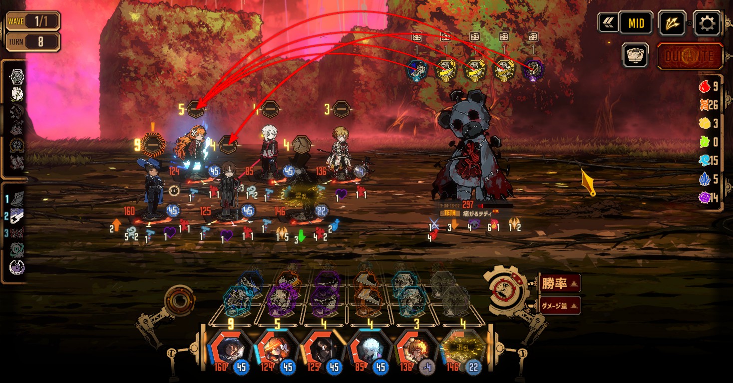 →2体に減ってからは、ボスの勝てない単体スキルは回避で踏み倒して資源を節約すると良い - 2体目が倒せる頃には、3体目のボスも良い感じに混乱区間まで削れてる(はず)