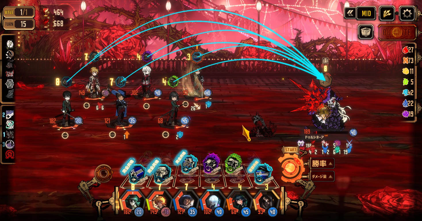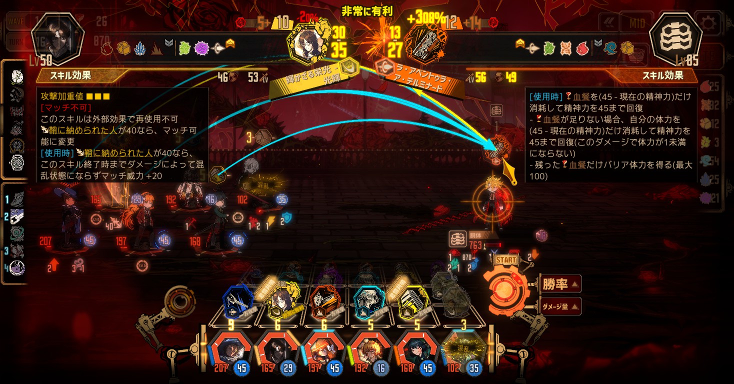 →スキル「チョッキン!」はマッチに強い人格が裁縫対象になってマッチするか、速度が高い味方が代わりにマッチする。 - 毎ターン、ドゥルシネーアの「歩みは優雅に…」と誰かがマッチする。(攻撃バフを他のボスに配るので阻止したい)