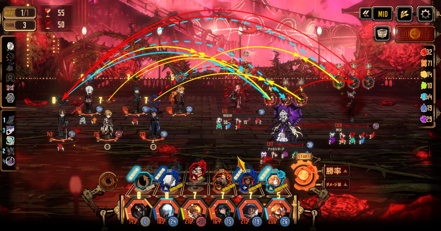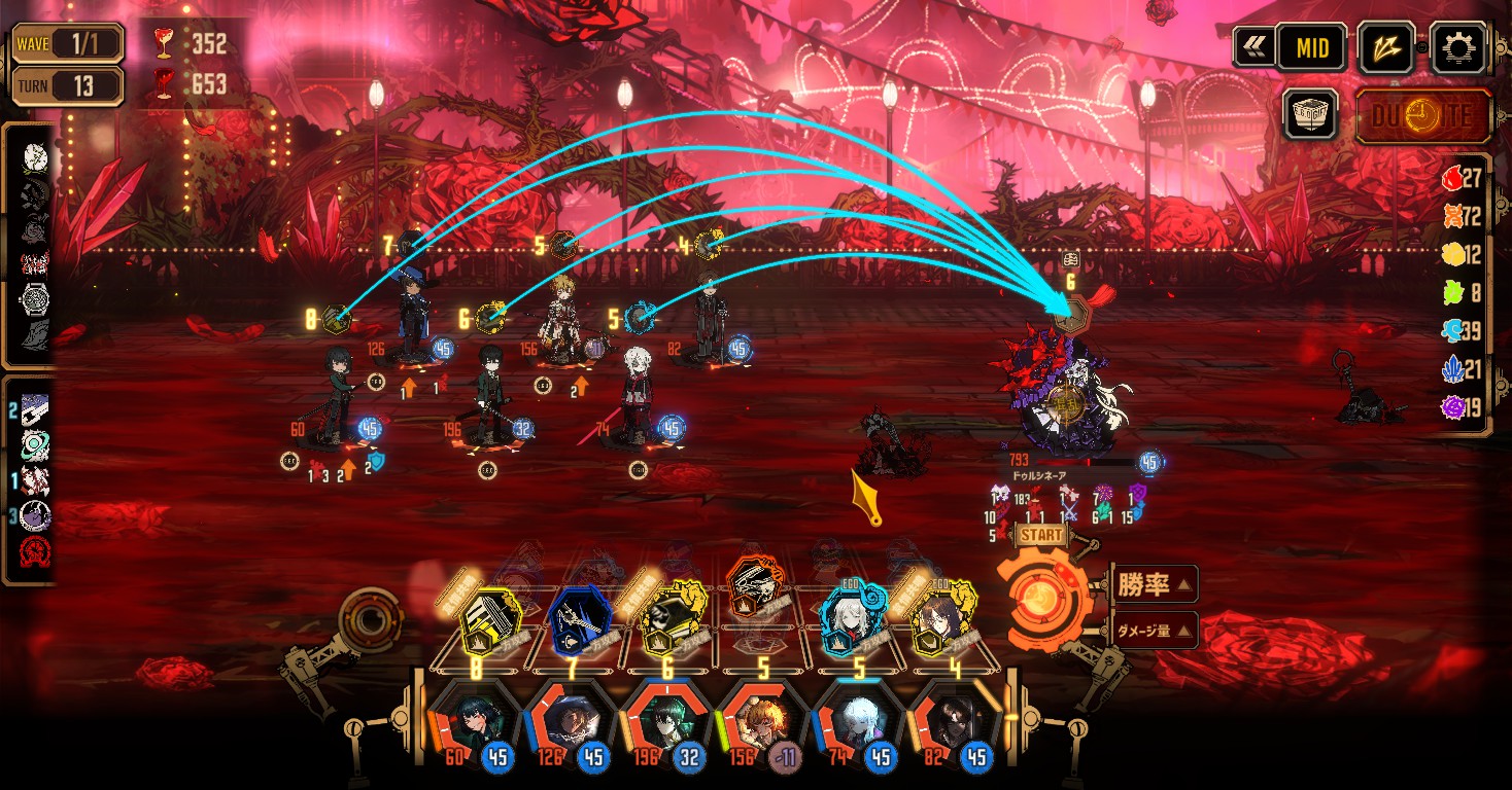 - ほぼ毎ターン誰かが棘の投げ縄のターゲットになるので、攻撃スキルや広域のスキルまたはEGOで毎ターン掃除すること(棘の投げ縄は、物理属性2倍なので倒すのは簡単です)
