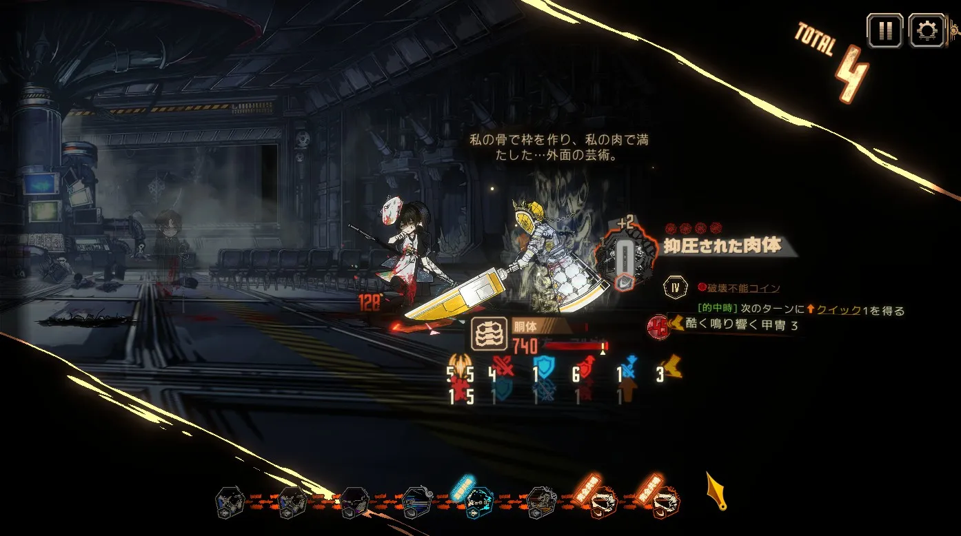 アルビナ登場後、8ターン目に生体材料スタックが2たまるので、アルビナは大技「抑圧された身体」を使用します。