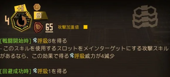 - 「回」スロットに攻撃スキルを置くと、スキル効果で増加する呼吸威力が4に減る