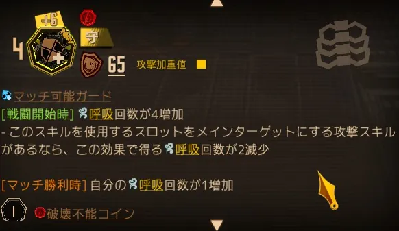 - 「反」の囚人マッチ勝利とターン終了時の分を含めると、1ターンに増える呼吸回数を2に減らせる