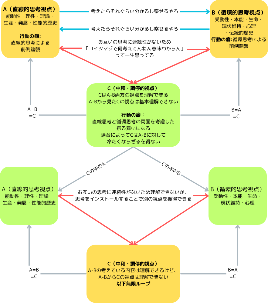 両者が出会ったときに物事の処理の方法が真逆だから予想に反する状況とかトラブルが発生する