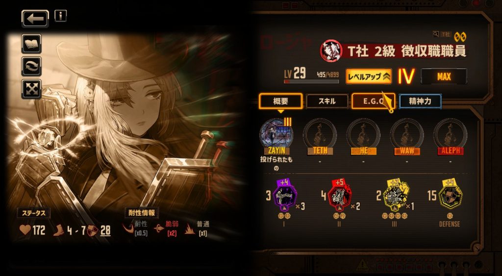 - ムルソーの初期EGO「他人の鎖」を撃つ(敵の攻撃威力を下げるEGO=マッチに勝ちやすくなって精神力が上がる)