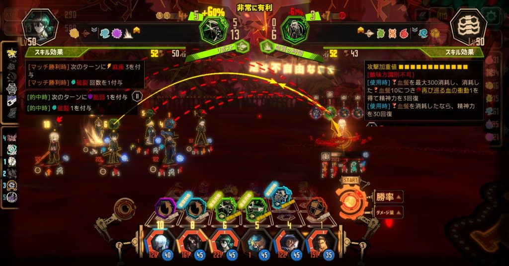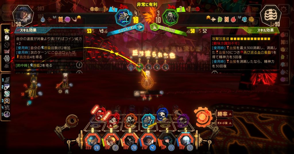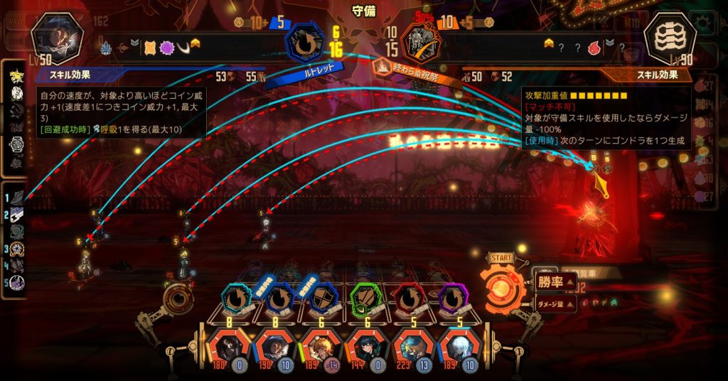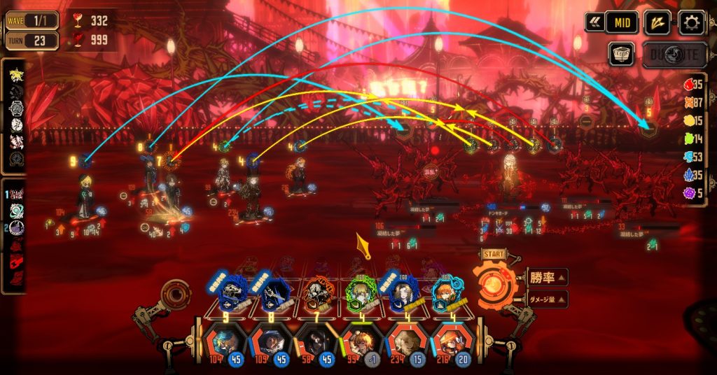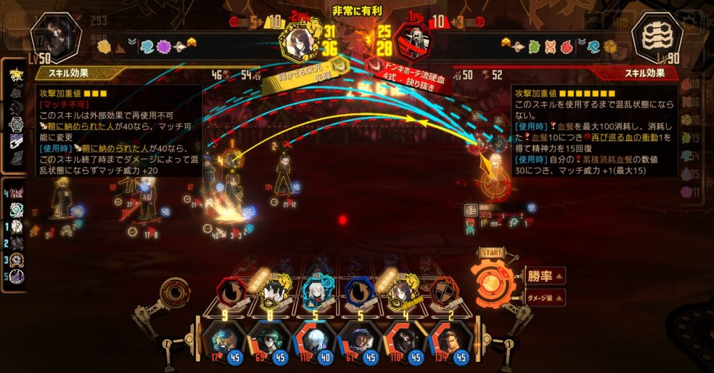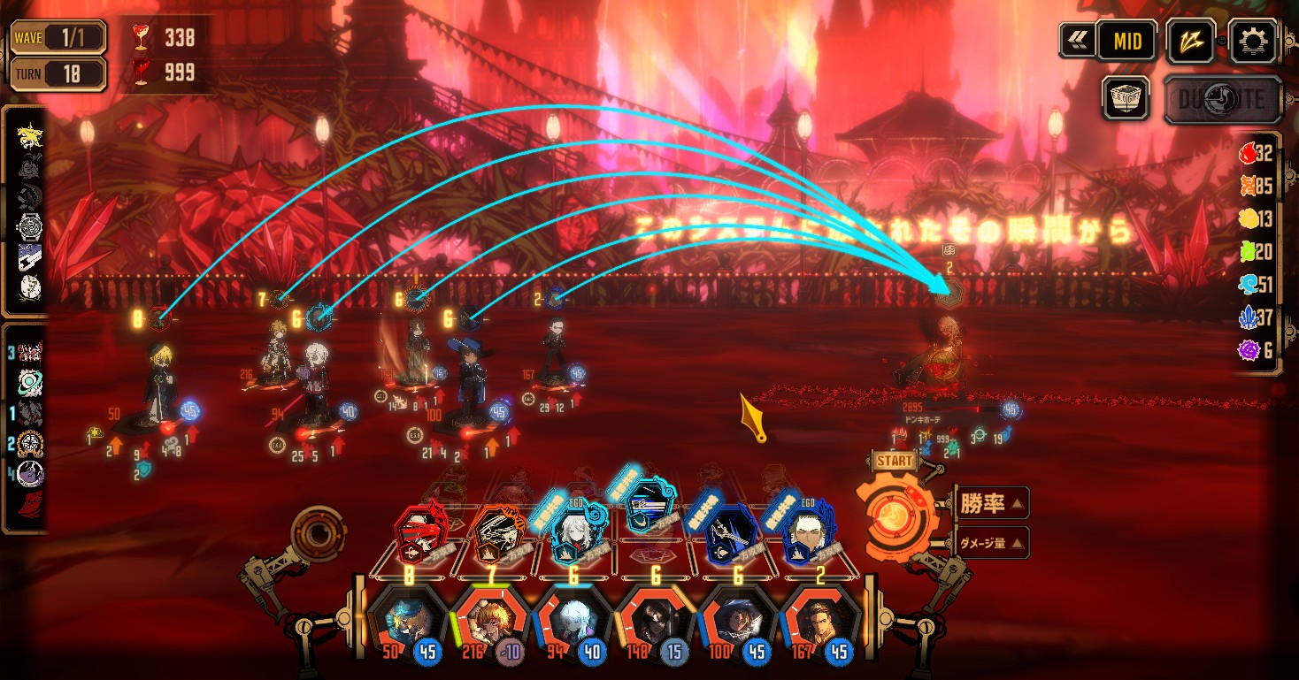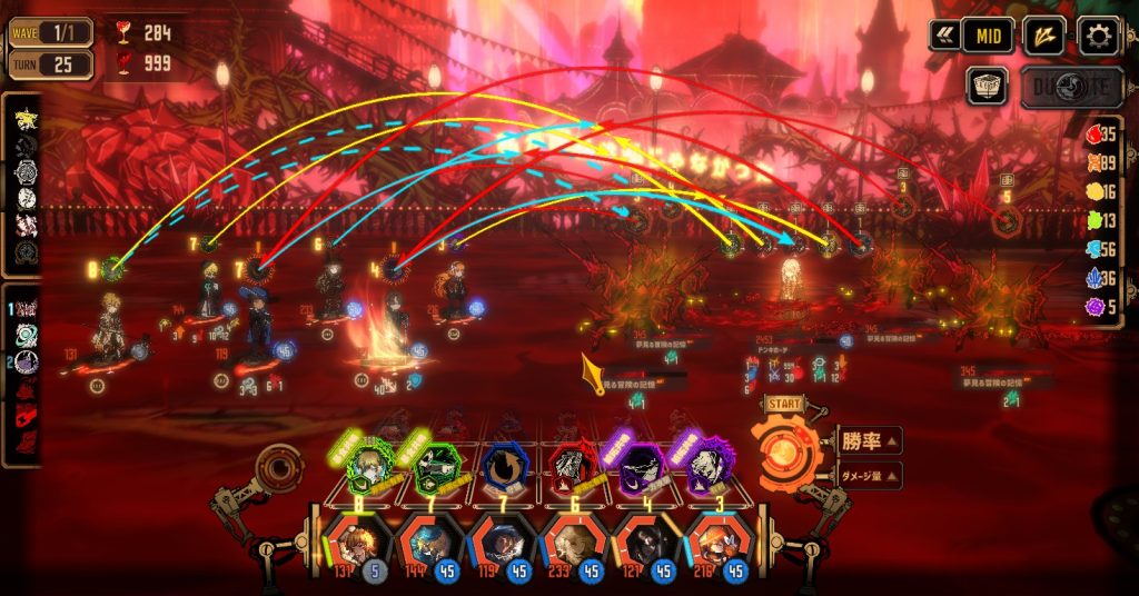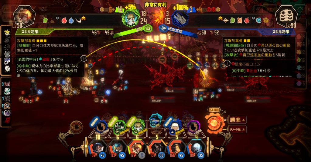 上記スクショの例だと、そろそろファウストから控えのロージャ(回復持ち)に交代した方がいいところです。