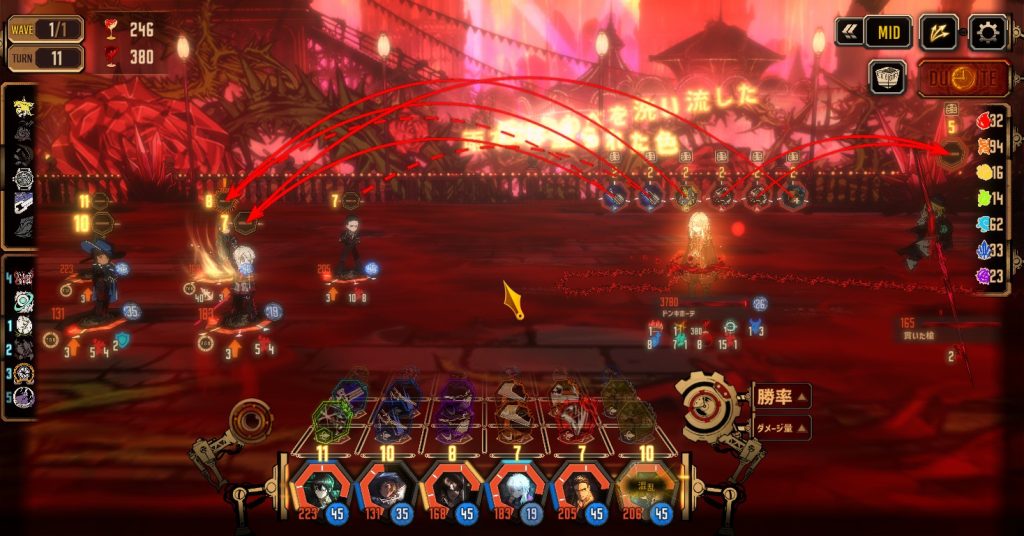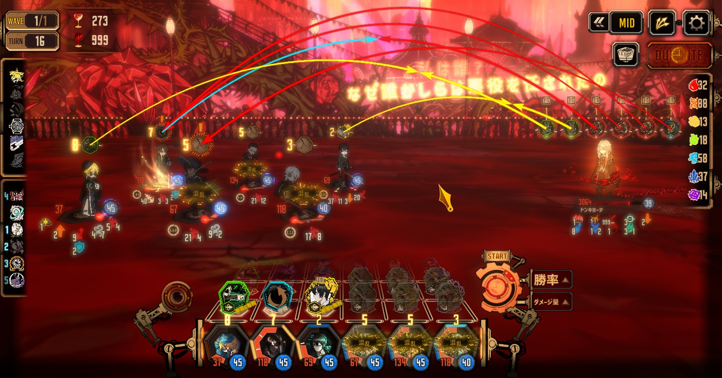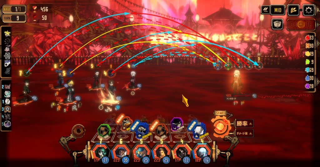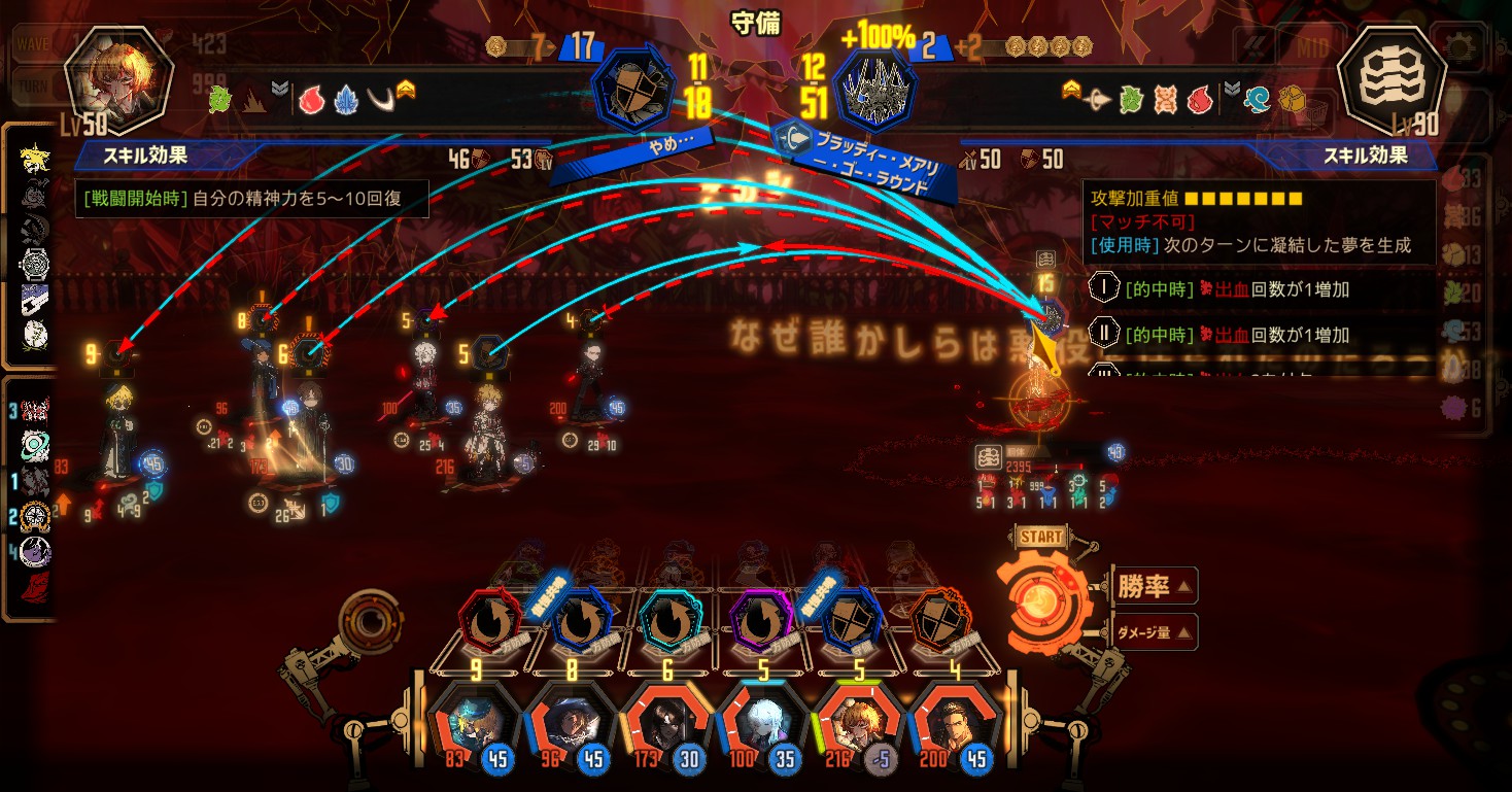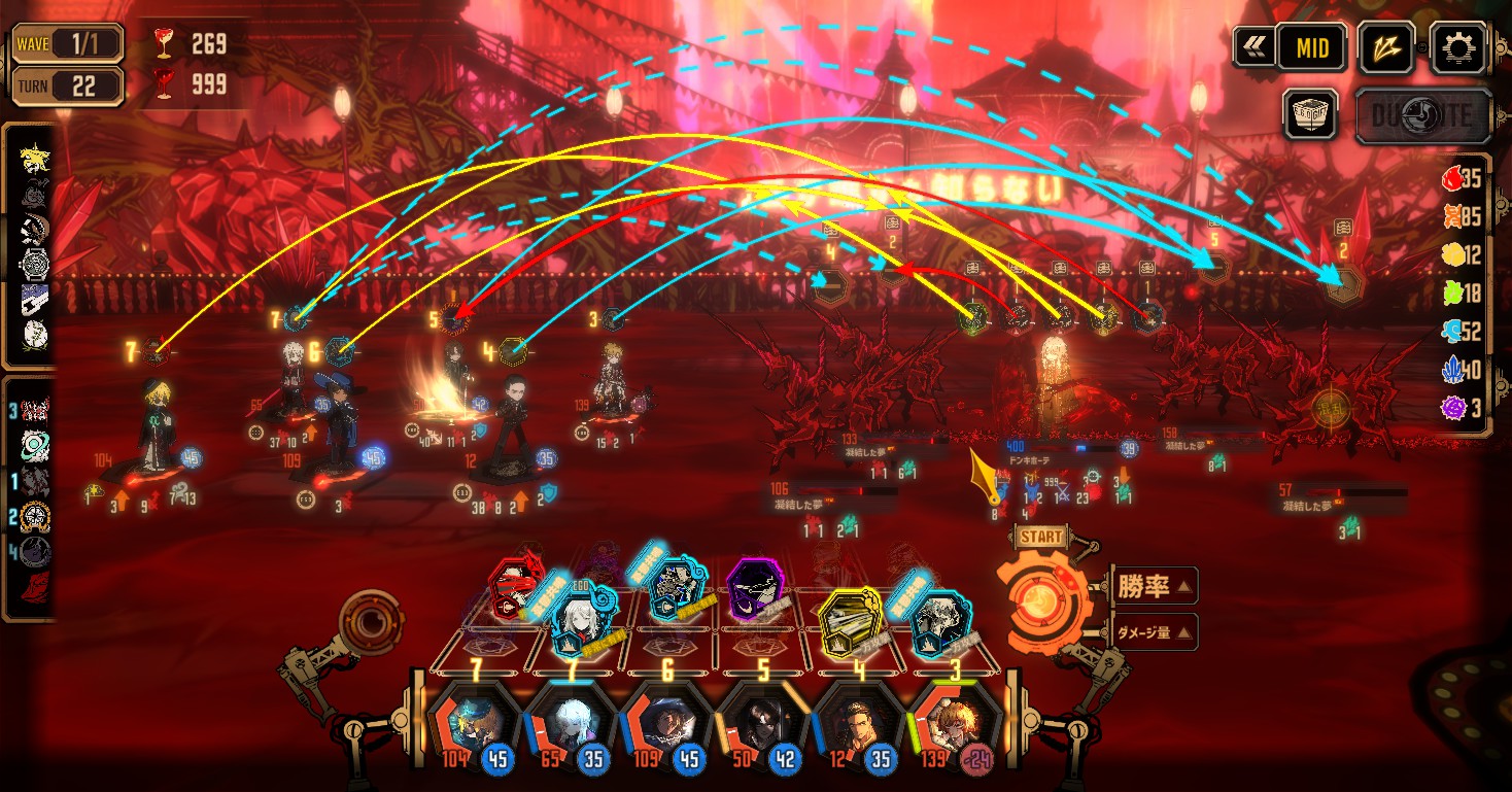 上記スクショの例だと、そろそろファウストから控えのロージャ(回復持ち)に交代した方がいいところです。