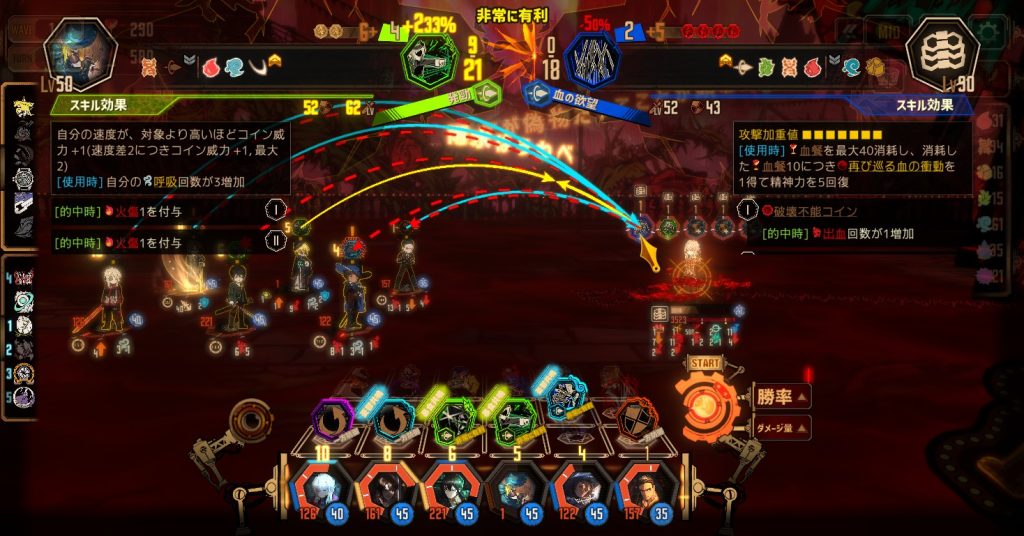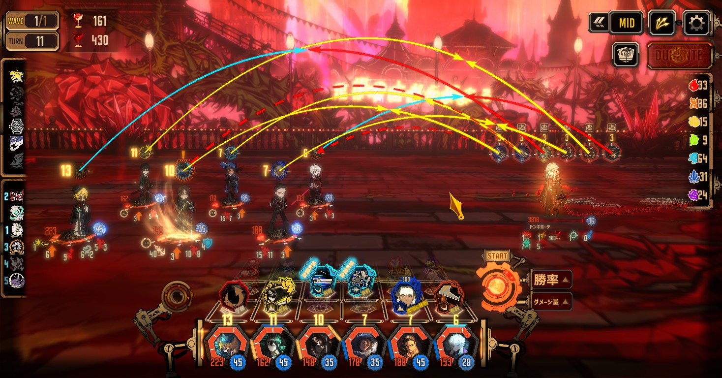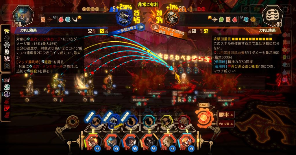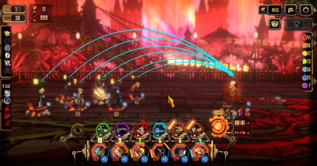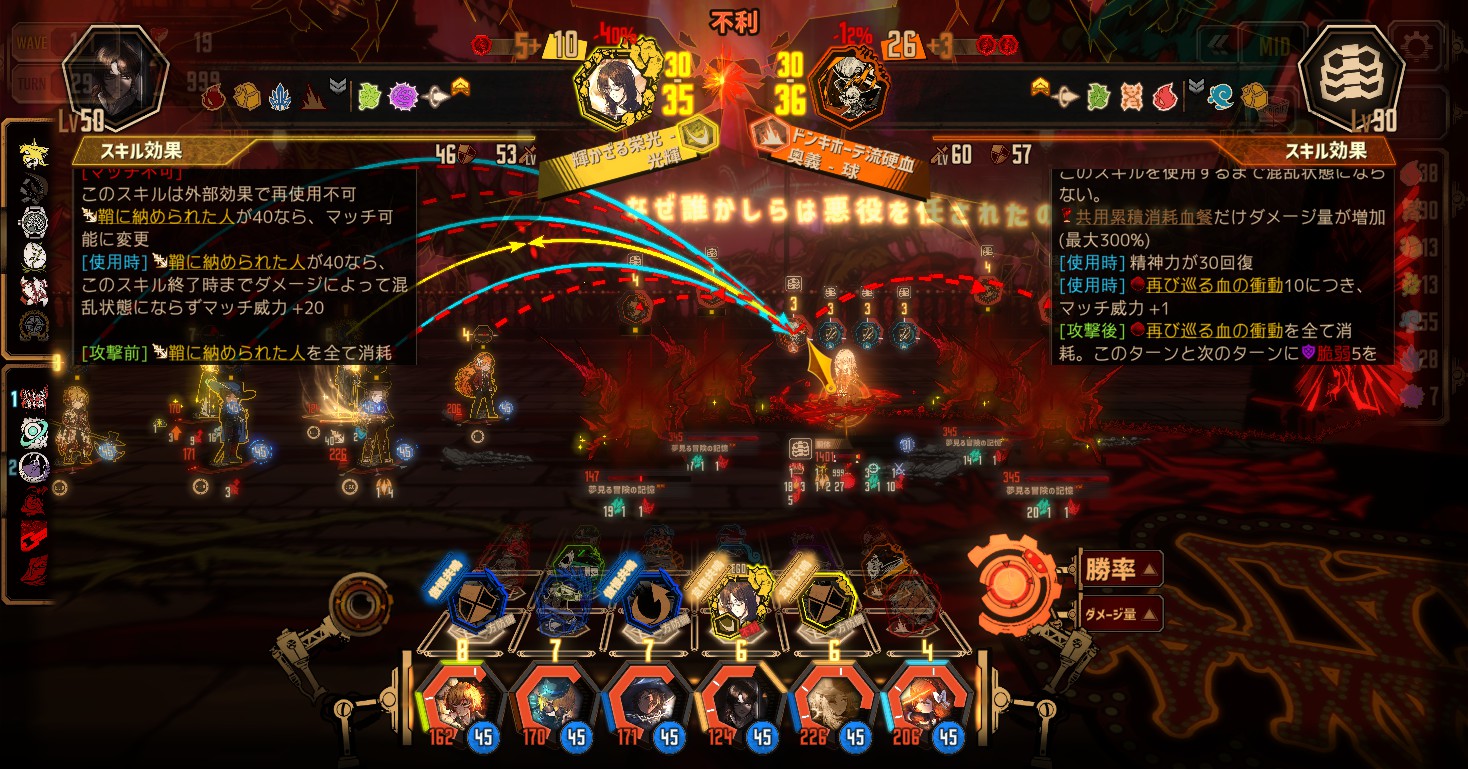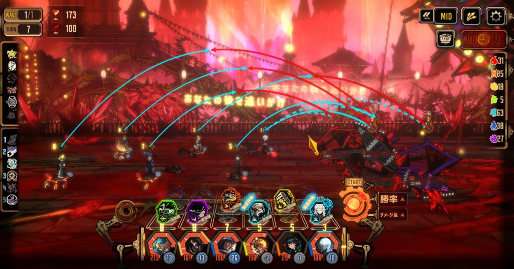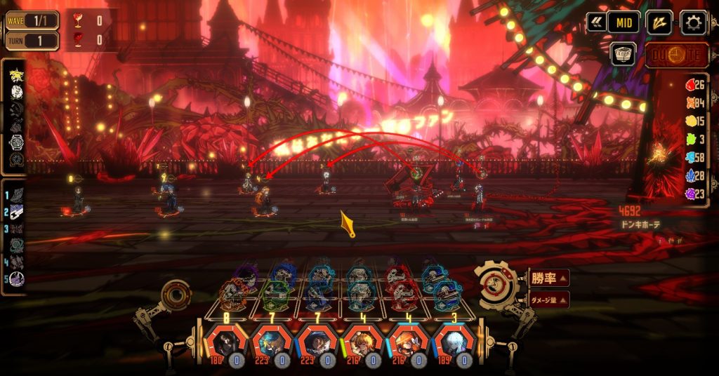 上記スクショの例だと、そろそろファウストから控えのロージャ(回復持ち)に交代した方がいいところです。