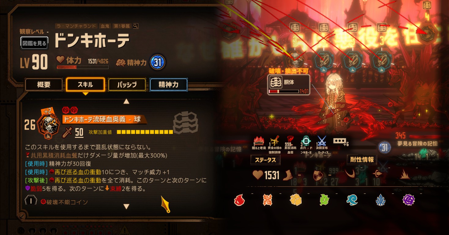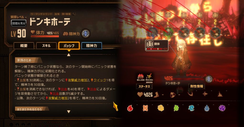 - 精神力を下げるとパニックタイプ「責任の重さ」で攻撃威力増加、速度上昇の強化バフが入る