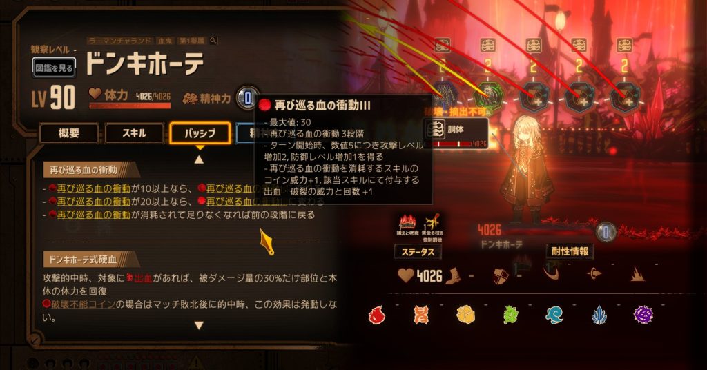 →血の衝動2段階目(スタック10以上・最大値20)で、数値5につき攻撃レベル1増加・防御レベル1増加、血の衝動を消耗するスキルのマッチ威力+1、それに該当するスキルの出血・破裂の威力と回数+1