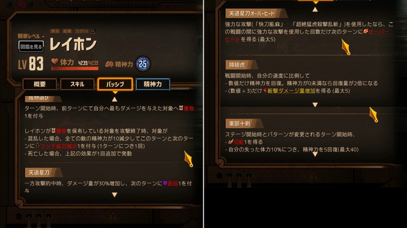 (パッシブによるクイック獲得量と精神力回復量の増加、大技の攻撃加重値の増加)