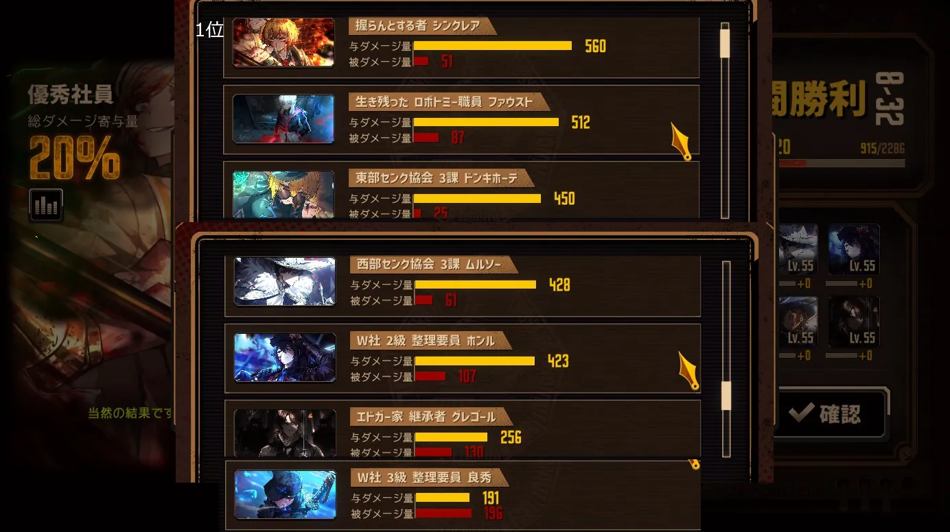 大体前章と一緒のメンバーですが、ロボトミー職員ファウストがめずらしく2位に来ました。